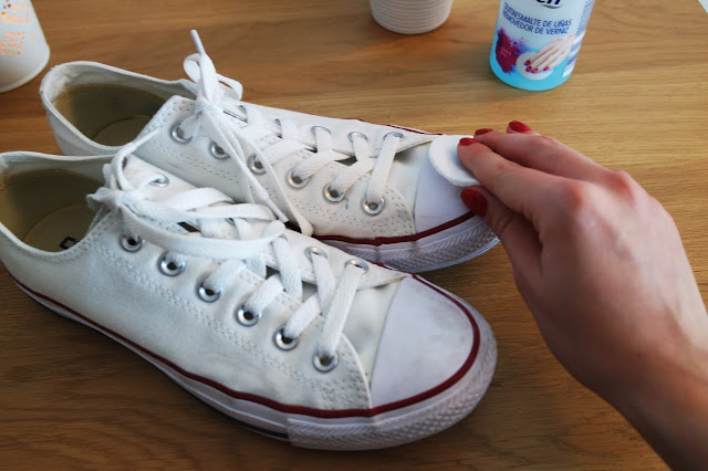Só precisam de acetona e de algodão (aconselho a usarem discos de algodão para ser mais fácil a movimentação do mesmo). É só molhar o algodão com acetona e passarem na sola branca dos vossos sapatos. Com calma e paciência vão logo notar que a sujidade sai toda. Tenham cuidado para só passarem a acetona na parte branca da sola e não no resto do sapato.